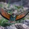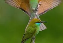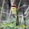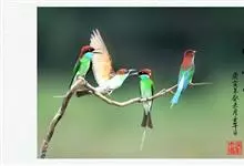 栗喉蜂虎是蜂虎科蜂虎属的鸟类。有热带鸟类羽毛艳丽的特征:喉部是栗红色的,黑色的过眼纹,翅膀和背部是绿色的,尾翼是蓝色的,飞行时翅膀下面的羽毛是橙黄色的,在阳光的照射下,它们全身闪烁着金属般的艳丽光泽,…全部>>