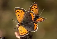 橙灰蝶Lycaena dispar Hauorth,鳞翅目、灰蝶科。这类蝴蝶雌雄异型,雄蝶前翅翅面橙色,顶角向边缘有窄的黑带;后翅基部和臀缘有较宽的黑色区;雌蝶前翅翅面橙色,中室内有2个黑斑,后翅黑…全部>>