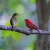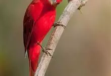 普通朱雀是雀形目雀科朱雀属鸟类,又名红朱雀、马料、青麻料。雄鸟上体红色,下体淡红色;头部、喉部、胸部及腰部亮红色;背部褐色染红色;两翼及尾黑褐色,羽缘染红色。雌鸟上体橄榄褐色,下体近白色,…全部>>