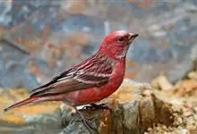 藏朱雀:全长约17-18厘米。雄鸟头部深红色具光辉,喉部暗红色具白色点斑;背部灰白色,各羽具玫瑰红色羽端,形成许多斑纹;腰部淡玫瑰红色;翅暗褐色,沾灰白,羽端沾玫瑰红或灰白色;尾暗棕色,端缘玫瑰红色…全部>>