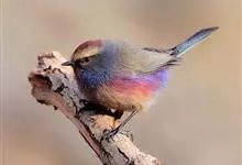 凤头雀莺:小型鸟类。体长9-10厘米,雄鸟呈毛茸茸的紫色和绛紫色,顶冠淡紫灰色,额及凤头白色,尾全蓝。雌鸟喉及上胸白,至臀部渐变成淡紫色,耳羽灰,…全部>>