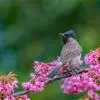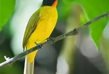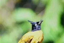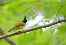 黑冠黄鹎:体长18-21厘米,是一种中等体型偏黄色鹎。整个头、颈、颏、喉黑色,头顶有显著直立的羽冠,黑色,上体褐橄榄黄绿色,下体橄榄黄色。虹膜偏红;嘴及脚黑色。…全部>>