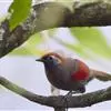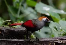 赤尾噪鹛中型鸟类,体长24~28厘米。头顶至后颈红棕色,两翅和尾鲜红色,眼先、眉纹、颊、颏和喉黑色,眼后有一灰色块斑。其余上下体羽大都暗灰或橄榄灰色。特征极明显,特别是通过鲜红色的头顶、翅和尾。…全部>>