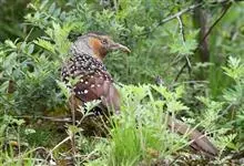 大噪鹛:中型鸟类,体长32-36厘米。额至头顶黑褐色,背栗褐色满杂以白色斑点,斑点前缘或四周还围有黑色。初级覆羽、大覆羽和初级飞羽具白色端斑。尾特长,均具黑色亚端斑和白色端斑。颏、喉棕褐色,…全部>>
