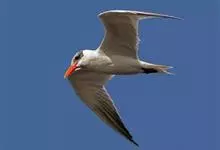 红嘴巨鸥,大型水鸟,体长47~55厘米。夏羽前额、头顶、枕和冠羽黑色。后颈、尾上覆羽和尾白色,尾呈叉状。背、肩和翅上覆羽银灰色。眼先和眼及耳羽以下头侧白色;颏、喉和整个下体也为白色。冬羽和夏羽大致相似,…全部>>
