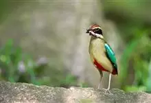 绿胸八色鸫:是雀形目八色鸫科的鸟类,共有12个亚种。体长为16-18厘米,体重65-69克。体型圆胖,尾短,腿长。头黑,上体绿色,两翼深色而具白色斑纹,头顶至后枕深褐,胸及腹部苹果绿,臀亮红。…全部>>