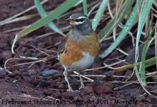 白眉鸫,是脊索动物门鸟纲雀形目鸫科鸫属中等体型的灰褐色鸫类。雄鸟头、颈、顺部至上颈灰色,具白色眉纹和下眼圈,眼先深色,上背至尾上覆羽橄榄褐色,上胸和两胁栗褐色,下胸、腹部和尾下覆羽白色,…全部>>