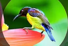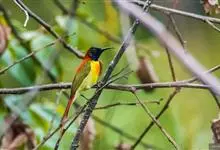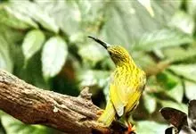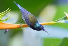 绿喉太阳鸟:共有9个亚种。小型鸟类,雄鸟体长13-15厘米、雌鸟10-12厘米。雄鸟前额至后颈、颏和喉辉绿色,头侧黑色,颈侧和背暗红色,两肩、下背橄榄绿色,腰鲜黄色,尾上覆羽和中央尾羽暗绿色,…全部>>
