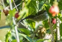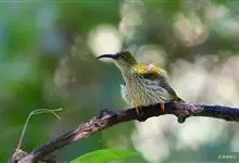 纹背捕蛛鸟:为太阳鸟科捕蛛鸟属的鸟类。是太阳鸟科中体型较大的一种,体重25-45克,体长160-210毫米。嘴粗长而尖且向下弯曲。上体橄榄黄色具黑色中央斑纹。下体淡黄白色满布黑色纵纹,尾具黑色次端斑。…全部>>
