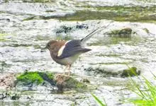红尾歌鸲:体长13-15厘米。上体橄榄褐色。尾羽棕栗色,眼先和颊黄褐色,眼周淡黄褐色。下体颏、喉污灰白色,微沾皮黄色,胸部具橄榄色扇贝形纹,两胁橄榄灰白色,腹部和尾下覆羽与颏、喉同。尾部棕色。…全部>>