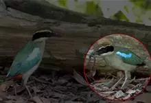 蓝八色鸫是雀形目八色鸫科的鸟类,体长约24厘米,体重109克左右。体型圆胖,尾短,腿长。羽色鲜艳,头顶两侧橘黄色的宽带延伸至颈背,宽宽的过眼纹黑色,脸颊皮黄,髭纹黑,尾亮蓝色。雌鸟较雄鸟色暗,…全部>>