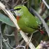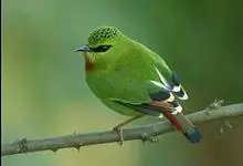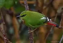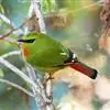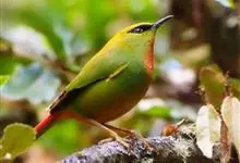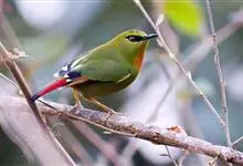 火尾绿鹛是莺科、绿鹛属小型鸟类,体长11-14厘米。上体绿色,头顶至枕具黑色鳞状斑,眼先和眼后黑色,眉纹黄绿色。两翅黑色具黄色和红色翅斑及白色端斑,极为醒目。中央一对尾羽绿色,外侧尾羽鲜红色。…全部>>