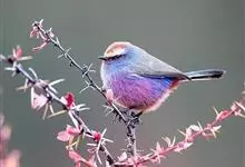 凤头雀莺:小型鸟类。体长9-10厘米,雄鸟呈毛茸茸的紫色和绛紫色,顶冠淡紫灰色,额及凤头白色,尾全蓝。雌鸟喉及上胸白,至臀部渐变成淡紫色,耳羽灰,…全部>>