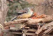 大噪鹛:中型鸟类,体长32-36厘米。额至头顶黑褐色,背栗褐色满杂以白色斑点,斑点前缘或四周还围有黑色。初级覆羽、大覆羽和初级飞羽具白色端斑。尾特长,均具黑色亚端斑和白色端斑。颏、喉棕褐色,…全部>>