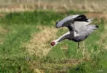 东非冕鹤是大型涉禽。体长127厘米。额部向外凸出,有乌黑色绒羽,枕部有由无数条土黄色绒丝向四周放射所形成的绒球状冠羽。眼睛后方的面颊有上红下白的斑块。颈长。喉部有红色肉垂。体羽主要为浅蓝灰色,…全部>>