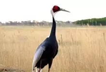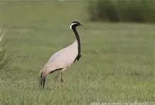 蓑羽鹤大型涉禽,体长68~92厘米,是鹤类中个体最小者。通体蓝灰色,眼先、头侧、喉和前颈黑色,眼后有一白色耳簇羽极为醒目。前颈黑色羽延长,悬垂于胸部。脚黑色,飞翔时翅尖黑色。…全部>>