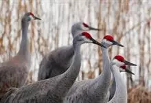 沙丘鹤别名棕鹤、加拿大鹤,是鹤形目鹤科鹤属大型涉禽。成鸟两性相似,雌鹤略小,眼先、前额和头顶裸露部分红色;上体石板灰色,翅覆羽较淡,羽缘锈棕色,羽轴深黑色;尾羽石板灰色,颈部灰蓝色,…全部>>