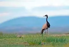 蓑羽鹤大型涉禽,体长68~92厘米,是鹤类中个体最小者。通体蓝灰色,眼先、头侧、喉和前颈黑色,眼后有一白色耳簇羽极为醒目。前颈黑色羽延长,悬垂于胸部。脚黑色,飞翔时翅尖黑色。…全部>>