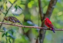 普通朱雀是雀形目雀科朱雀属鸟类,又名红朱雀、马料、青麻料。雄鸟上体红色,下体淡红色;头部、喉部、胸部及腰部亮红色;背部褐色染红色;两翼及尾黑褐色,羽缘染红色。雌鸟上体橄榄褐色,下体近白色,…全部>>
