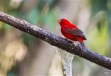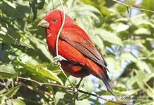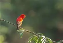 血雀雀科朱雀属鸟类,体重36-49克;体长155-182毫米。雄鸟除眼先、翼与尾为黑色外,通体为鲜红色;嘴鲜黄;雌鸟暗橄榄绿色,羽端较淡或带黄色;腰鲜黄;嘴较暗。虹膜褐色;嘴黄色;腿和脚褐色。…全部>>