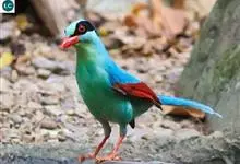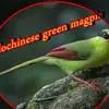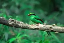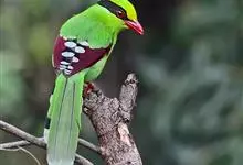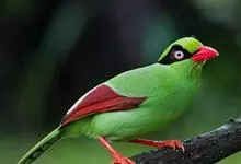蓝绿鹊:中型鸟类,共有5个亚种。体长36-38厘米。尾长,嘴、脚红色。通体羽色主要为草绿色,宽阔的黑色贯眼纹向后延伸到后颈,在绿色的头侧极为醒目。两翅栗红色,内侧飞羽具黑色次端斑和白色尖端。尾绿色,…全部>>