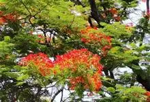 凤凰木 Raf.) ,别名火树、红花楹、凤凰花、火凤凰、金凤花、红楹,是豆科凤凰木属高大落叶乔木,树皮灰褐色,粗糙。二回偶数羽状复叶互生,矩圆形,两面均被柔毛。伞房式总状花序,花大,花瓣5枚,圆形,…全部>>