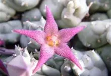 大花犀角是夹竹桃科犀角属的多年生肉质草本植物,茎基部分枝,有齿状突起,灰绿色,形如犀牛角,花大,五裂张开,星形淡黄色,具淡黑紫色横斑纹,边缘密生长细毛,具臭味;花期在7—8月。大花犀角原产地在南非,…全部>>