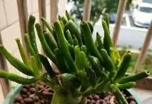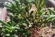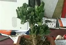筒叶花月,是景天科青锁龙属的多年生草本植物。植株多分株,灌木状,茎较粗壮,圆柱形,表皮灰褐色;叶片肉质,互生,呈圆筒状,簇生于茎或分枝顶端,叶端呈斜截形,截面为椭圆形;花呈星状,淡白色;花期秋季。…全部>>