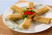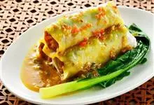 腐皮卷素菜是一道广东省的传统名菜,属于粤菜系。把香菇用清水浸软,去蒂,切细丝,胡萝卜,榨菜分别洗净,切细丝,豆芽,韭黄分别洗净,韭黄切段。用2汤匙油爆香姜丝,胡萝卜,榨菜,放入香菇同炒透,将豆芽放入…全部>>