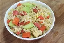 什锦炒饭是一道色香味俱全的名点,以江苏扬州的炒饭最知名。虾仁去泥肠洗净,加料酒、胡椒粉、淀粉上浆。胡萝卜洗净,切小片。蘑菇洗净、切块。将虾仁、豌豆粒、蘑菇倒入沸水锅中,焯烫至断生,捞出沥水。…全部>>