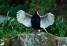 白鹇,是鸡形目雉科鹇属的一种留鸟。雄鸟上体白色并具黑色纹,下体黑色,头顶具黑色长羽冠,尾白而长;雌鸟体型较小,以橄榄褐色为主,下体具白色或皮黄色细纹;虹膜褐色,眼周具红色裸皮,喙黄色,脚鲜红色。…全部>>