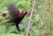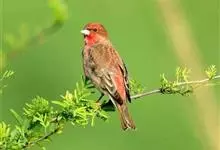 酒红朱雀小型鸟类,体长13~15厘米。雄鸟通体深红色,头部深朱红或棕红色,下背和腰玫瑰红色,眉纹粉红色而具丝绢光泽。两翅和尾黑褐或灰褐色、具暗红色狭缘,内侧两枚三级飞羽具淡粉红色先端。…全部>>