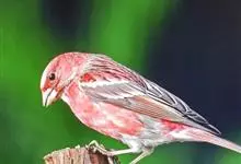 红腰朱雀:体长12-14厘米,小型鸟类。雄鸟前额和眉纹玫瑰粉红色,头顶和一宽的贯眼带深红褐色,背红棕褐色具暗褐色纵纹,腰玫瑰粉红色,两翅和尾暗褐色,羽缘色淡颊、头侧、颏、喉和其余下体玫瑰粉红色。雌鸟…全部>>