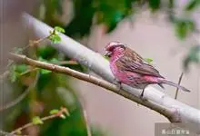 红腰朱雀:体长12-14厘米,小型鸟类。雄鸟前额和眉纹玫瑰粉红色,头顶和一宽的贯眼带深红褐色,背红棕褐色具暗褐色纵纹,腰玫瑰粉红色,两翅和尾暗褐色,羽缘色淡颊、头侧、颏、喉和其余下体玫瑰粉红色。雌鸟…全部>>