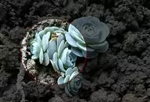 子持莲华 Hara)是景天科瓦松属多年生肉质草本植物。茎葡富,可萌生侧芽、易群生,叶片呈半圆形或长卵形,排列如莲座状、蓝绿色,表面略有白粉,…全部>>