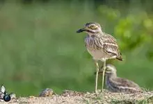 石鸻,是石鸻科、石鸻属的中型涉禽,体长40-45厘米。嘴粗厚、尖端黑色,基部黄色。脚长而粗、黄色,3趾,后趾缺失。上体淡沙灰褐色具黑褐色纵纹,前额和眼先白色。眼特别大、黄色,其外有一窄的黑圈,…全部>>