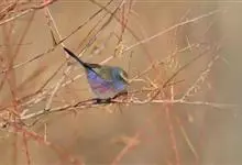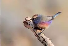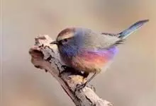 凤头雀莺:小型鸟类。体长9-10厘米,雄鸟呈毛茸茸的紫色和绛紫色,顶冠淡紫灰色,额及凤头白色,尾全蓝。雌鸟喉及上胸白,至臀部渐变成淡紫色,耳羽灰,…全部>>