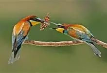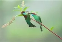 蓝喉蜂是蜂虎科蜂虎属鸟类。体长26-28厘米,嘴长而弯曲,有明显细长的中央尾羽。头部、颈部和背部为巧克力色,有黑色眼纹。喉部、腰部和尾羽为蓝色。腹部和两翼为绿色。幼鸟外观似成鸟,头部、颈部和背部为绿色,…全部>>