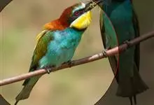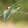 栗喉蜂虎是蜂虎科蜂虎属的鸟类。有热带鸟类羽毛艳丽的特征:喉部是栗红色的,黑色的过眼纹,翅膀和背部是绿色的,尾翼是蓝色的,飞行时翅膀下面的羽毛是橙黄色的,在阳光的照射下,它们全身闪烁着金属般的艳丽光泽,…全部>>