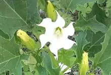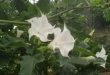 曼陀罗,茄科曼陀罗属一年生大型草本植物,全株光滑。有臭气;叶呈广卯形,边缘具不规则波状浅齿裂;花单生于枝杖间或叶腋,直立,有短梗;花萼是筒状裂片三角形,颜色为白色或淡紫色;果实为蒴果卵状,…全部>>