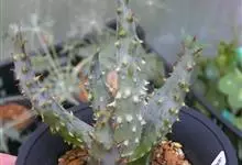 苏铁大戟:俗称“铁甲丸”。多年生的多肉植物,茎干深褐色,样似苏铁的茎干,茎干初期为绿色球型,然后呈圆筒状伸长,干高可达20公分左右,表面着生黑色菱形的瘤状突起,呈螺旋状排列,型似松果,苞片类似麒麟花,…全部>>
