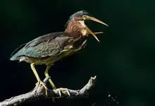 绿鹭:是鹳形目鹭科绿鹭属鸟类。体型小,头顶黑,枕冠亦黑色,上体蝉灰绿色,下体两侧银灰色;前额至后枕及冠羽墨绿色,眼后有一白斑,颊纹黑色;颚纹白色,后颈、颈侧和体侧烟灰色;背部披灰绿色矛状长羽,…全部>>