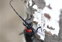 桃红颈天牛是天牛科、颈天牛属昆虫。体黑色发亮,前胸背面大部分为光亮的棕红色或完全黑色。头黑色,腹面有许多横皱,头顶部两眼间有深凹。触角蓝紫色,前胸背面前后缘呈黑色并收缩下陷密布横皱。鞘翅表面光滑。…全部>>