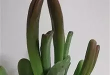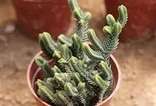 筒叶花月,是景天科青锁龙属的多年生草本植物。植株多分株,灌木状,茎较粗壮,圆柱形,表皮灰褐色;叶片肉质,互生,呈圆筒状,簇生于茎或分枝顶端,叶端呈斜截形,截面为椭圆形;花呈星状,淡白色;花期秋季。…全部>>
