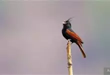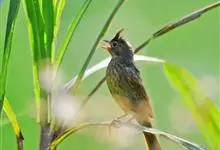 凤头鹀:属小型鸣禽,体重21-31克,体长134-175毫米。以头顶的细长羽冠为特征,雄鸟全身几乎均为黑色具蓝色光泽,两翅和尾以及尾上覆羽栗红色。雌鸟具短的褐色羽冠,上体暗橄榄褐色,…全部>>