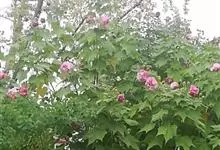 木芙蓉,锦葵科木槿属落叶灌木或小乔木。小枝上有细绒毛;叶片为卵状心形,托叶为披针形,常早落;花单生,花萼为钟形,花冠初为白色或淡红色,后逐渐变为深红色;果实为扁球形,有淡黄色的毛附着。花期8到10月。…全部>>