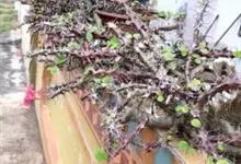 虎刺梅:别称铁海棠,是蔓生灌木植物。茎多分枝,长60-100厘米,直径5-10毫米,具纵棱,密生硬而尖的锥状刺,刺长1-1.5厘米,直径0.5-1.0 毫米,常呈3-5列排列于棱脊上,呈旋转。叶互生…全部>>
