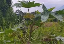 蓖麻是大戟科蓖麻属一年生粗壮草本或草质灌木。小枝、叶通常被白霜,茎直立,无毛,多液汁,绿色或稍带紫色,被白粉;叶轮廓近圆形,边缘具锯齿,叶柄粗壮,中空;蒴果卵球形或近球形,果皮具软刺或平滑;种子椭圆形,…全部>>