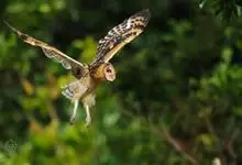 栗鸮:是鸟纲、草鸮科的猫头鹰。体长约29厘米,体重311-360克。是一种中等体型的红褐色鸮。其心形脸庞及时而竖起的“耳朵”与仓鸮甚似。上体红褐而具黑白点斑,下体皮黄偏粉具黑点,脸近粉色。虹膜深褐色,…全部>>