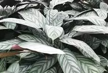 花叶竹芋:竹芋科,竹芋属匍匐状分枝草本植物,植株矮小,高可达40厘米,叶片长圆形、椭圆形至卵形,基部圆或心形,边缘多少波浪形,叶面粉绿色,总状花序单生,苞片内有对花,花冠白色,裂片披针形,夏、秋开花。全部>>